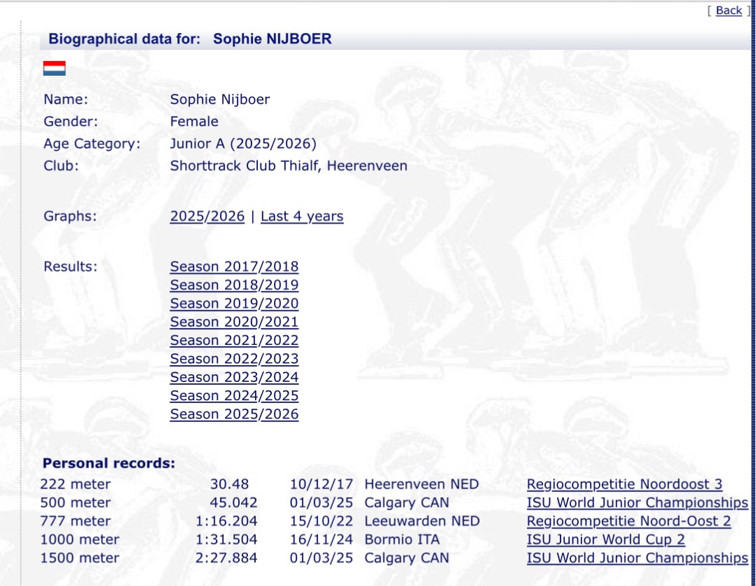 Al zeven winters lang werkt Sophie vol passie aan haar shorttrack-vaardigheden, en met succes! Ze heeft al veel mooie podiumplekken weten te veroveren, maar haar absolute hoogtepunt tot nu toe is haar Nederlandse titel, die ze in maart 2022 behaalde. Sophie heeft een groot droomdoel voor ogen: de Olympische Winterspelen van 2030! Maar ze heeft ook al indrukwekkende mijlpalen bereikt. Zo deed ze in januari 2023 mee aan de Jeugd Olympische Spelen in Italië, waar ze met de relayploeg een bronzen medaille won, heeft ze zich geplaatst voor haar eerste World Cup wedstrijden in november 2024 en behaalde ze daar een 8ste plaats op 1000 meter!